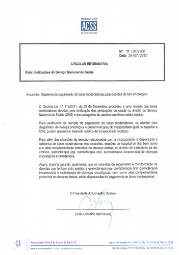 Circular Informativa N.º 17/2012/CD, de 24 de Julho de 2012, da Administração Central do Sistema de Saúde (ACSS) - Dispensa de pagamento de taxas moderadoras para doentes do foro oncológico.